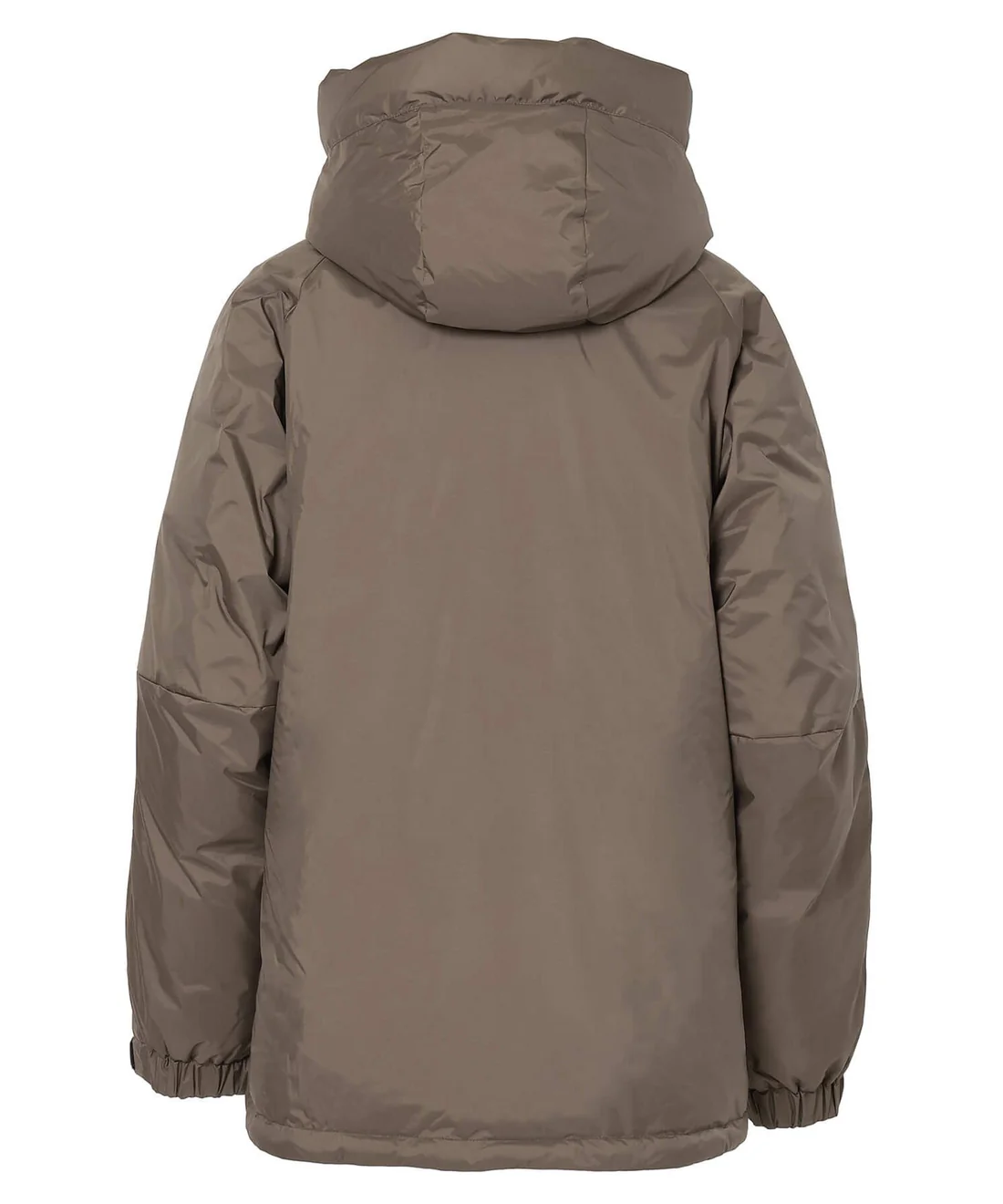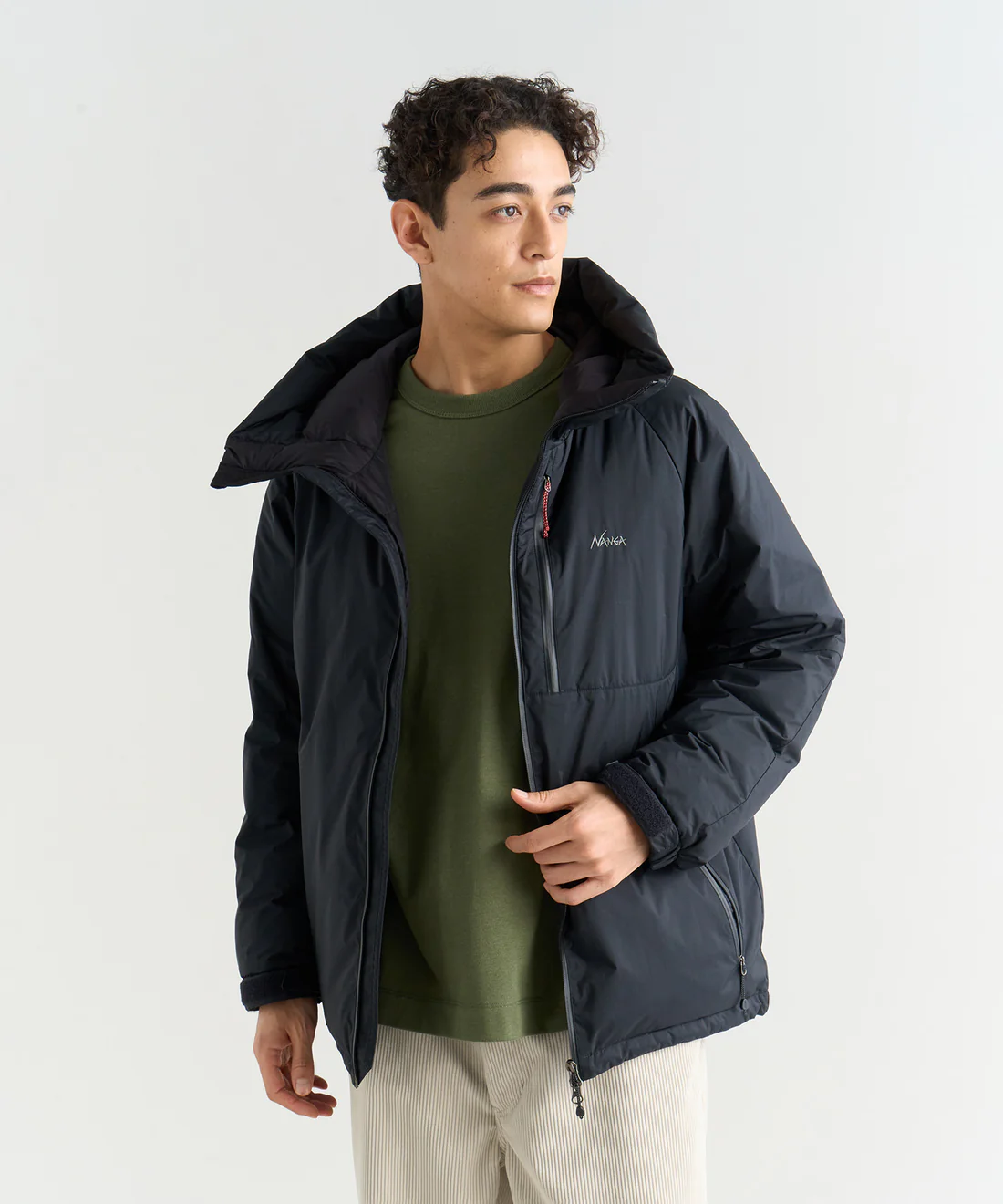 ネックまで覆う高めのフードは首元を暖かくキープし、ドローコードで調整可能です。
